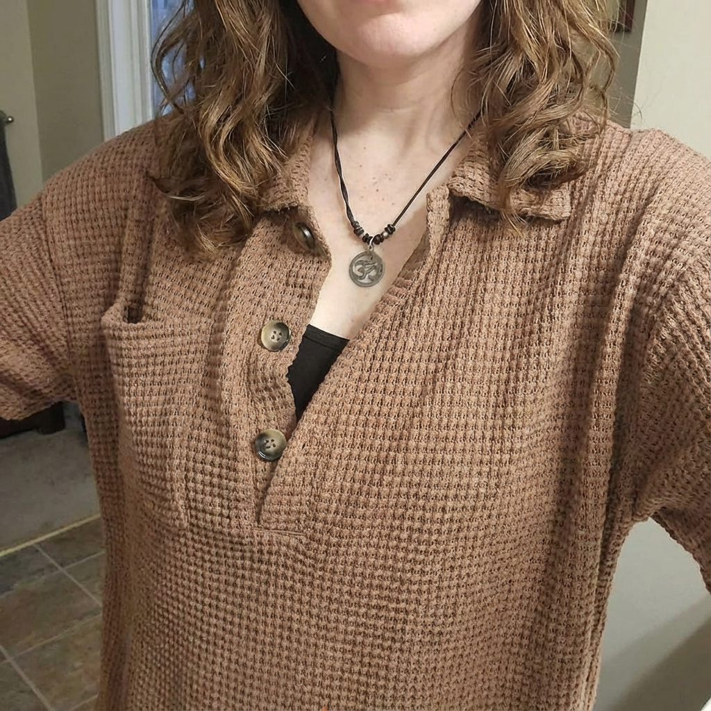 The oversized Henley is perfect for layering over a tank or tee. Brown color is warm and cozy!
