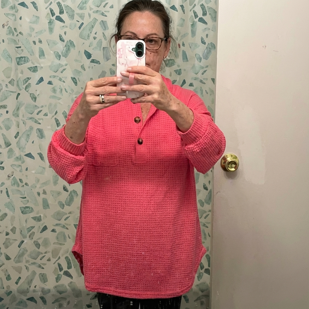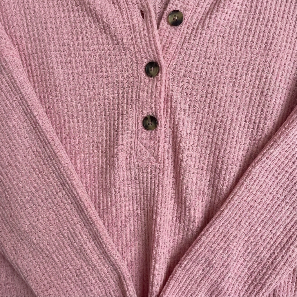 Love this top! The pink hue is soft and flattering. Waffle texture adds a nice casual touch.